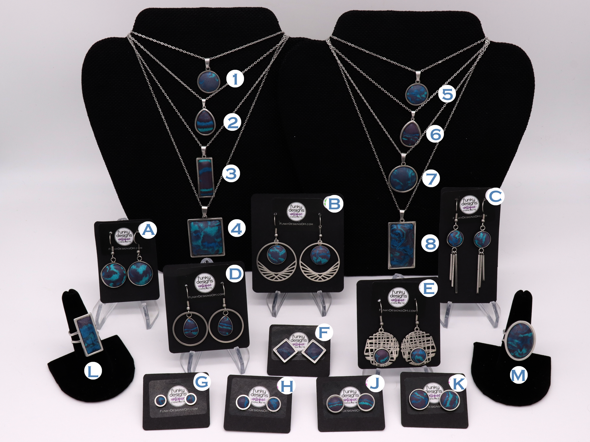 Each piece in this collection is the result of swirls of purple, blue, and teal pigmented artisan concrete mounted on stainless steel settings with stainless steel accents and hardware. The color theme was inspired the northern lights.