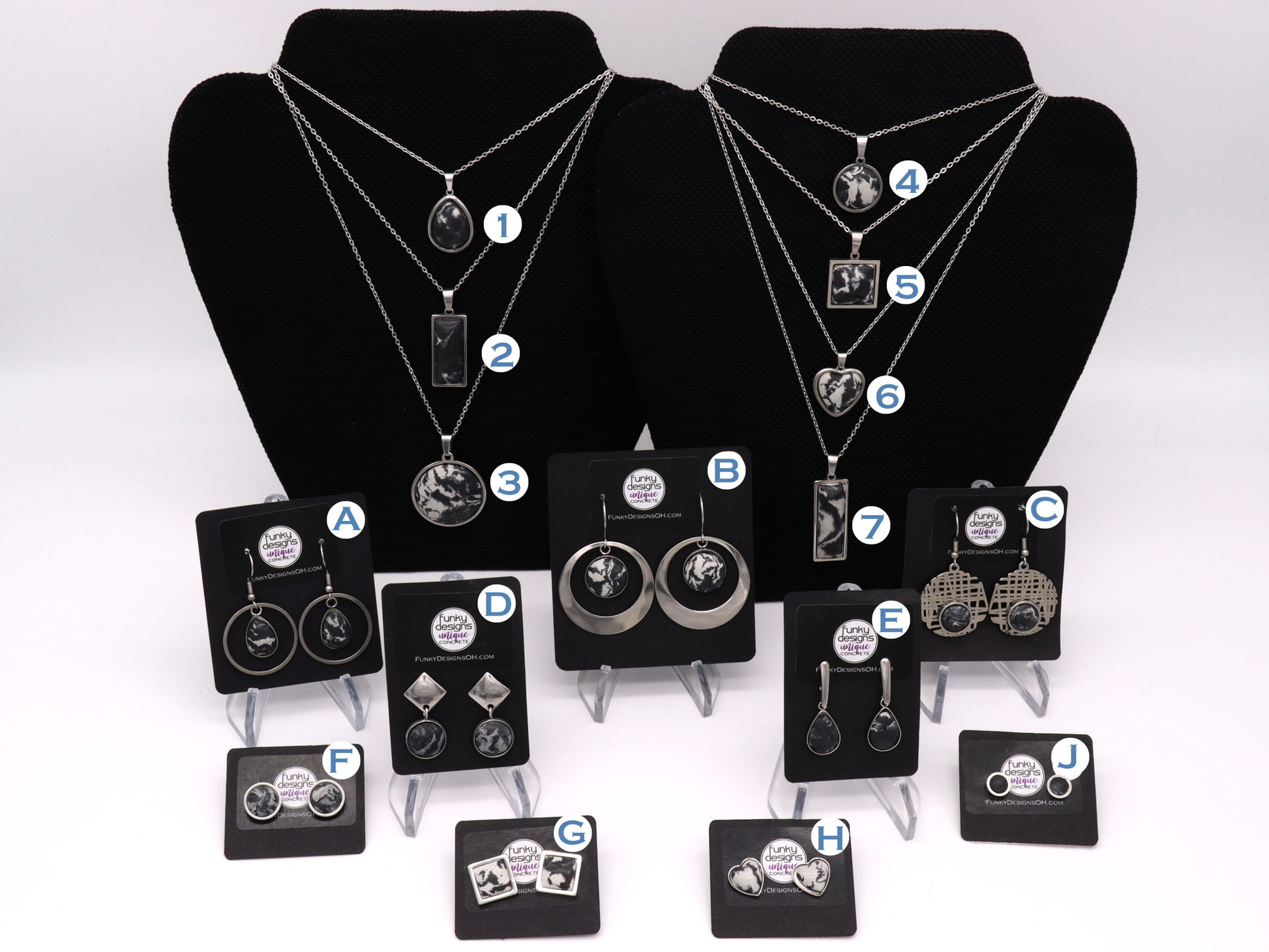 Each piece in this collection is the result of swirls of black and white pigmented artisan concrete mounted on stainless steel settings with stainless steel accents and hardware.