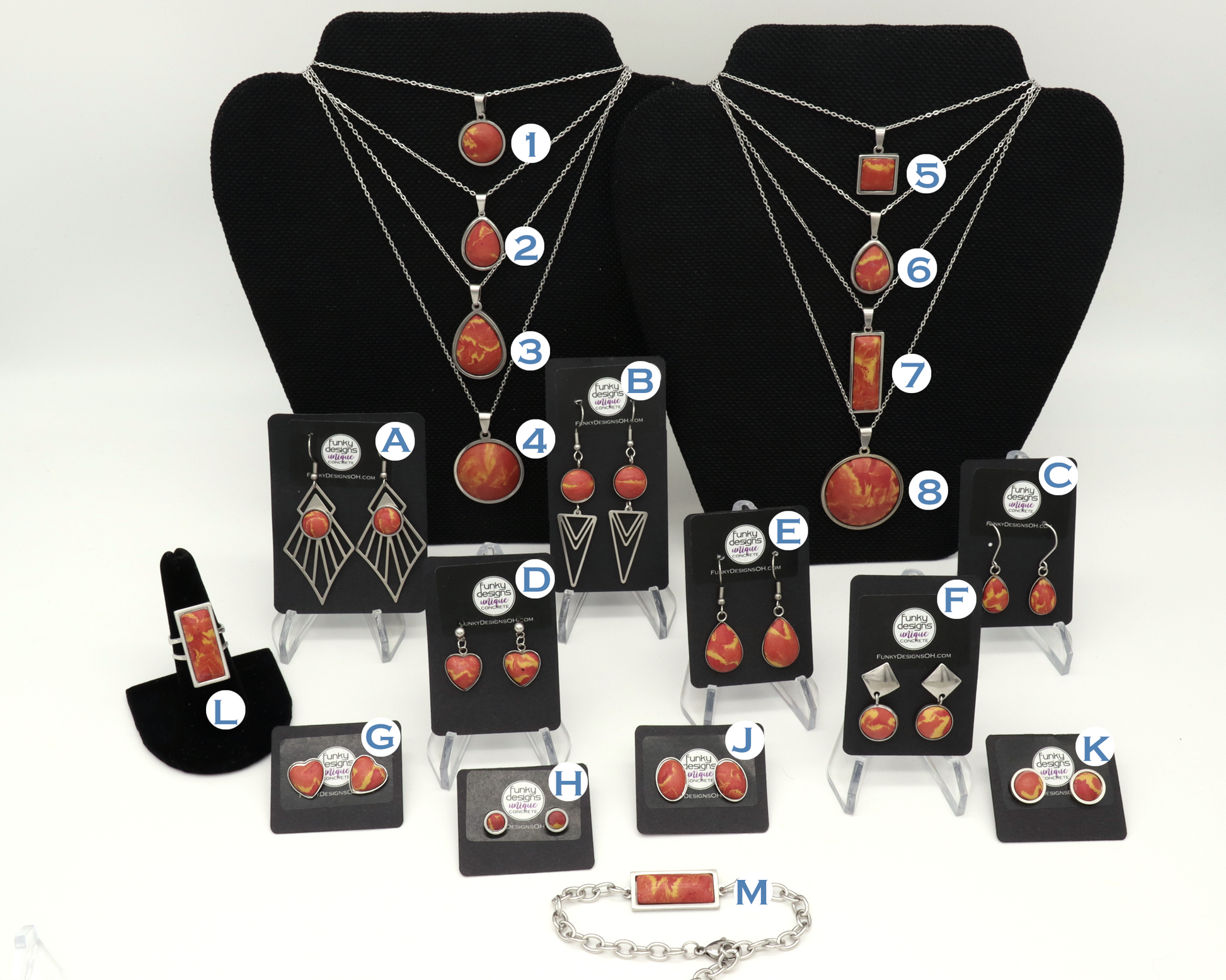 Each piece in this collection is the result of swirls of red, orange, and yellow pigmented artisan concrete mounted on stainless steel settings with stainless steel accents and hardware. The color theme was inspired hot fire coals.