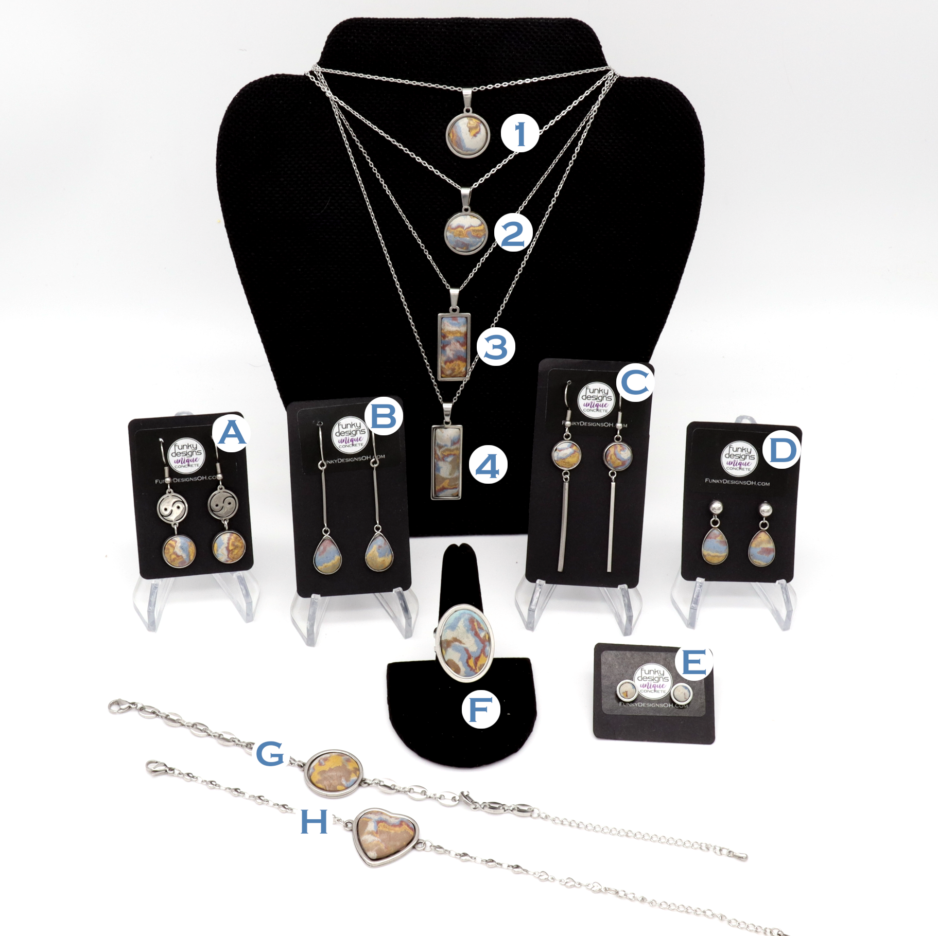 Each piece in this collection is the result of swirls of blue, gold, brown, and white pigmented artisan concrete mounted on stainless steel settings with stainless steel accents and hardware.