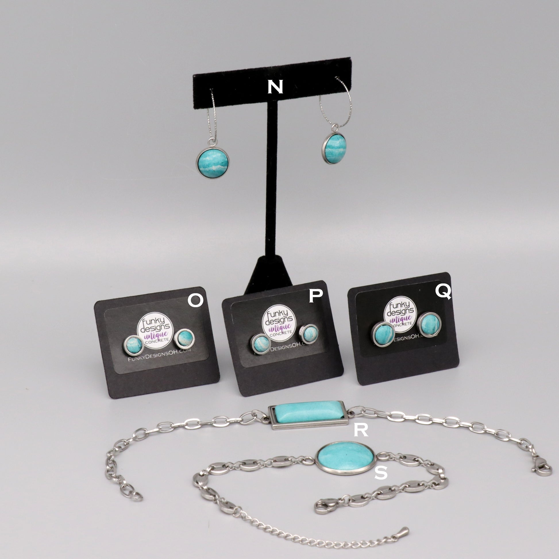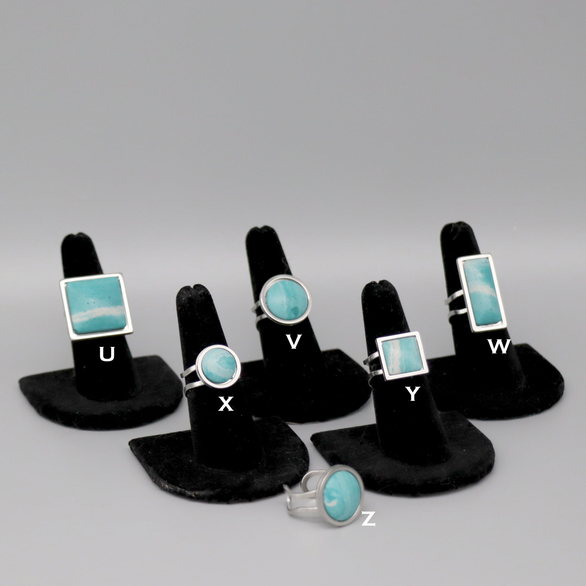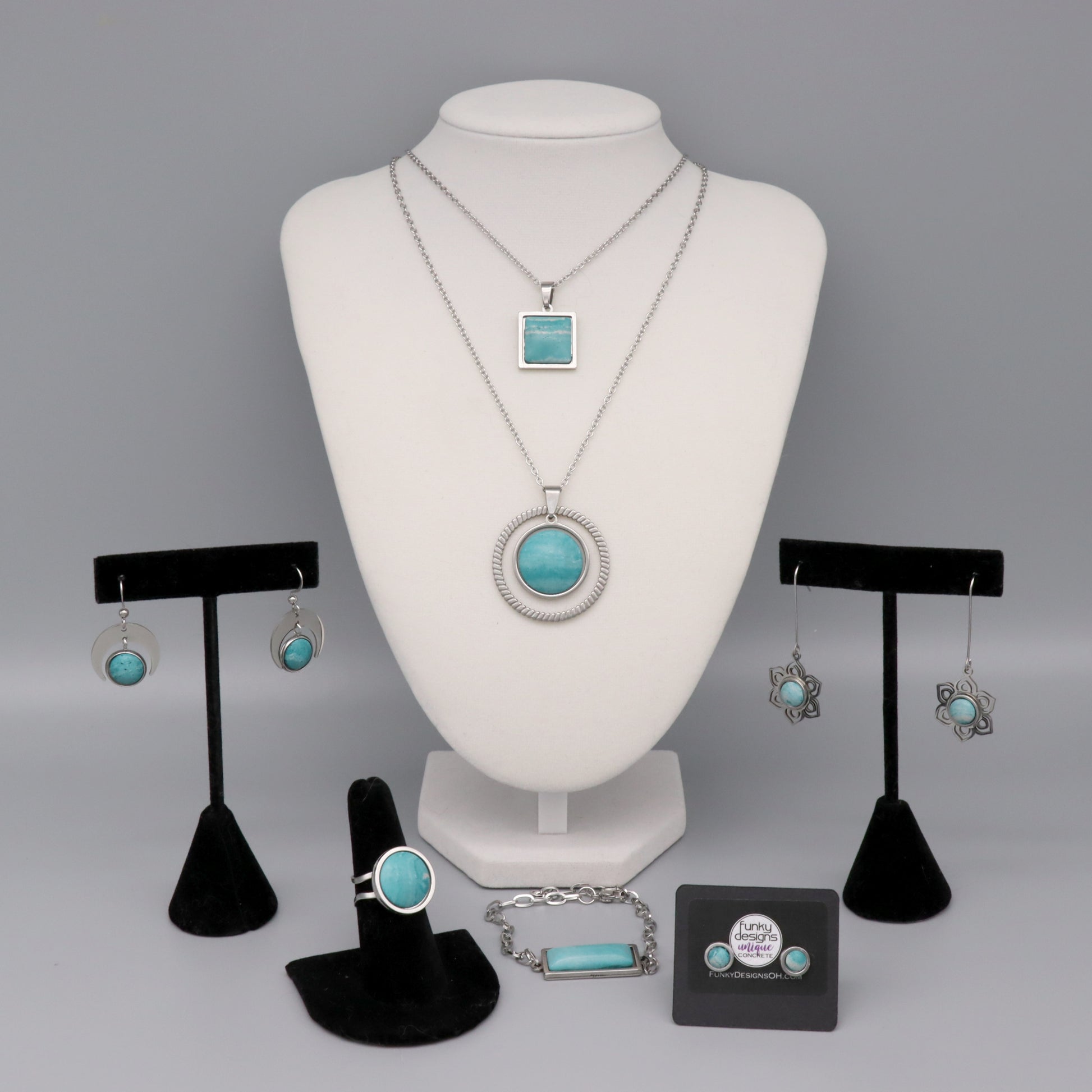 This month, the collection is inspired by the waters of the Bahamas. Each piece in this collection is the result of swirls of aqua and white pigmented artisan concrete mounted on stainless steel settings with stainless steel accents and hardware.