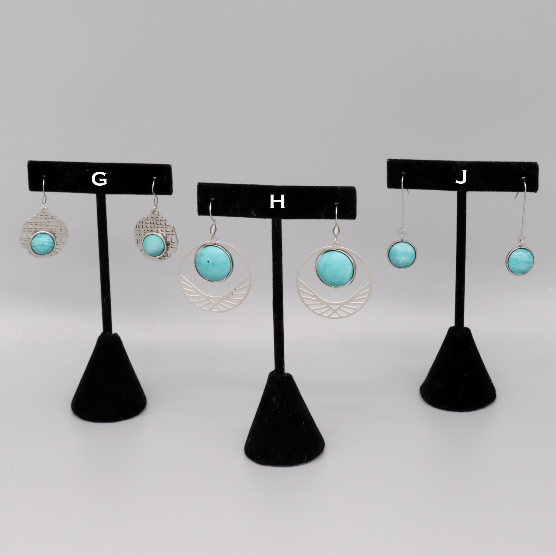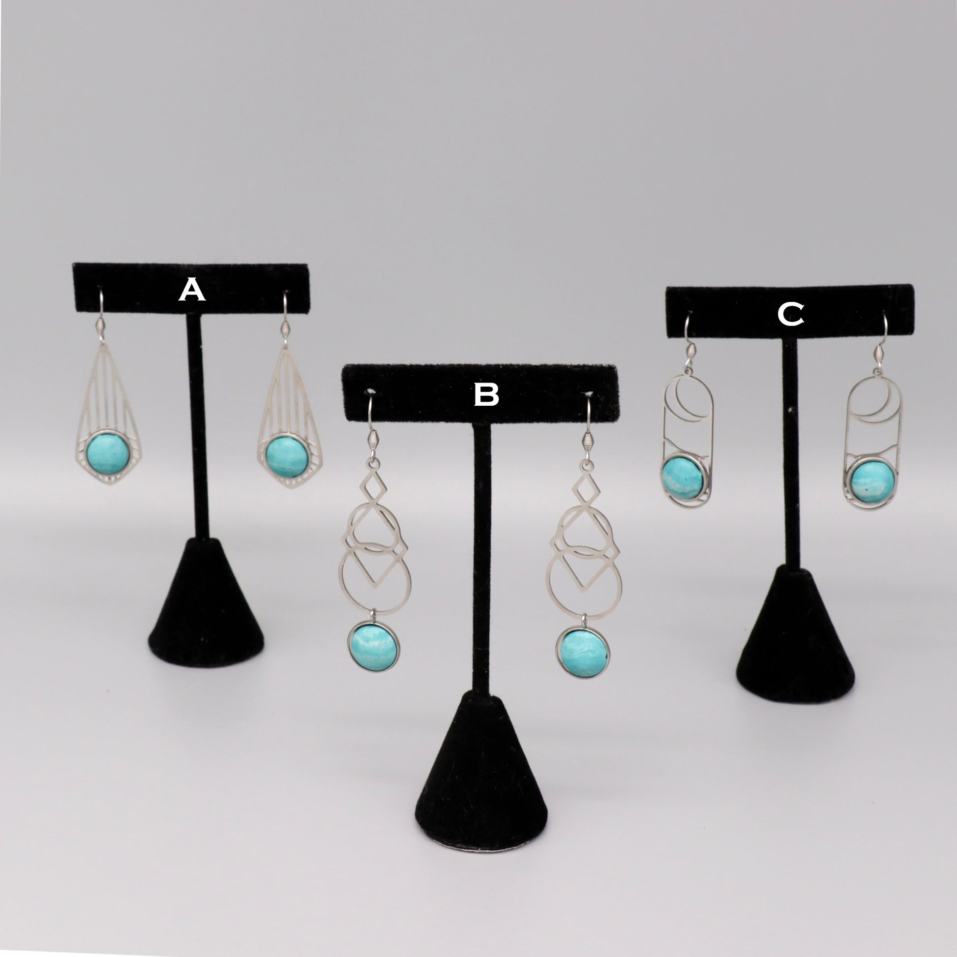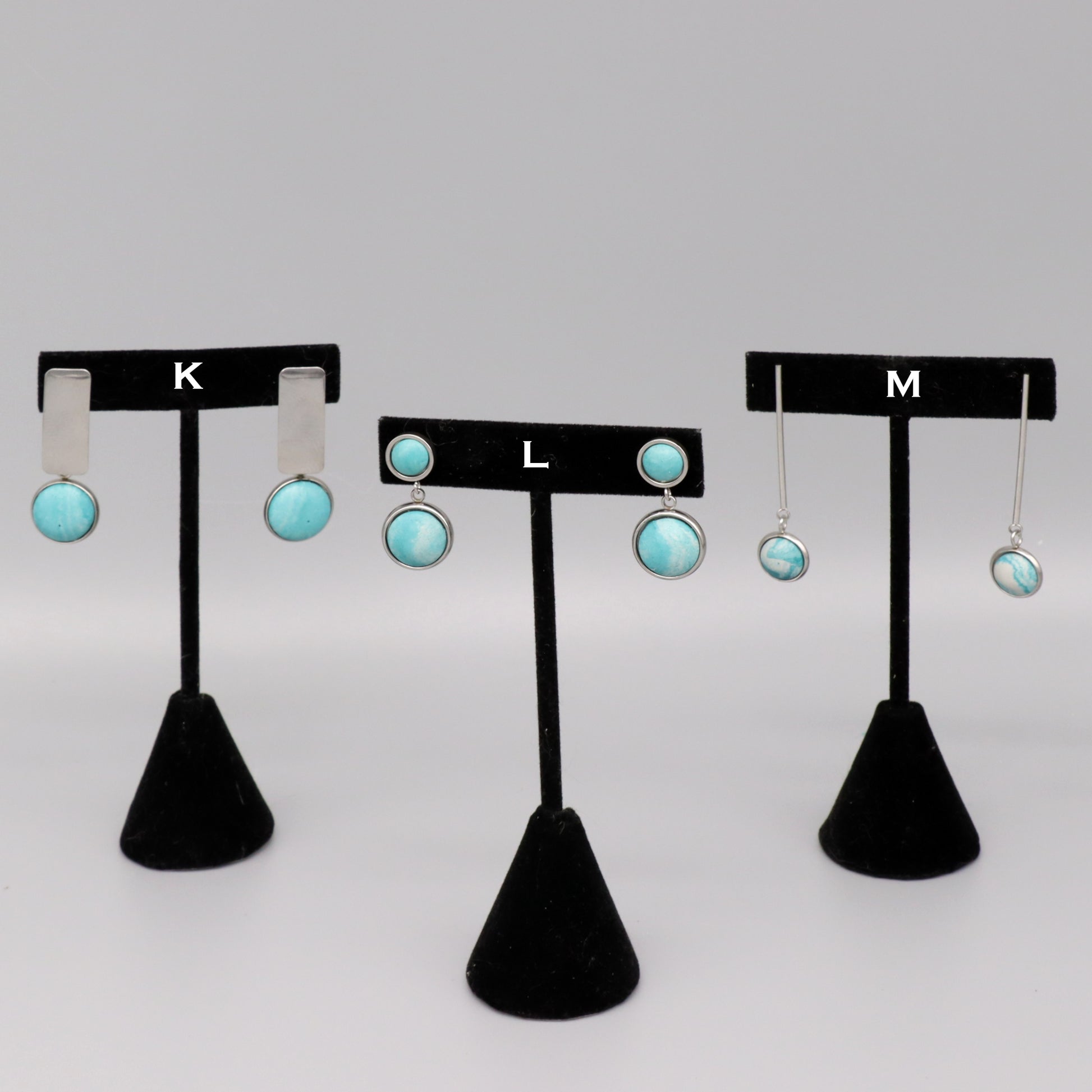 This month, the collection is inspired by the waters of the Bahamas. Each piece in this collection is the result of swirls of aqua and white pigmented artisan concrete mounted on stainless steel settings with stainless steel accents and hardware.