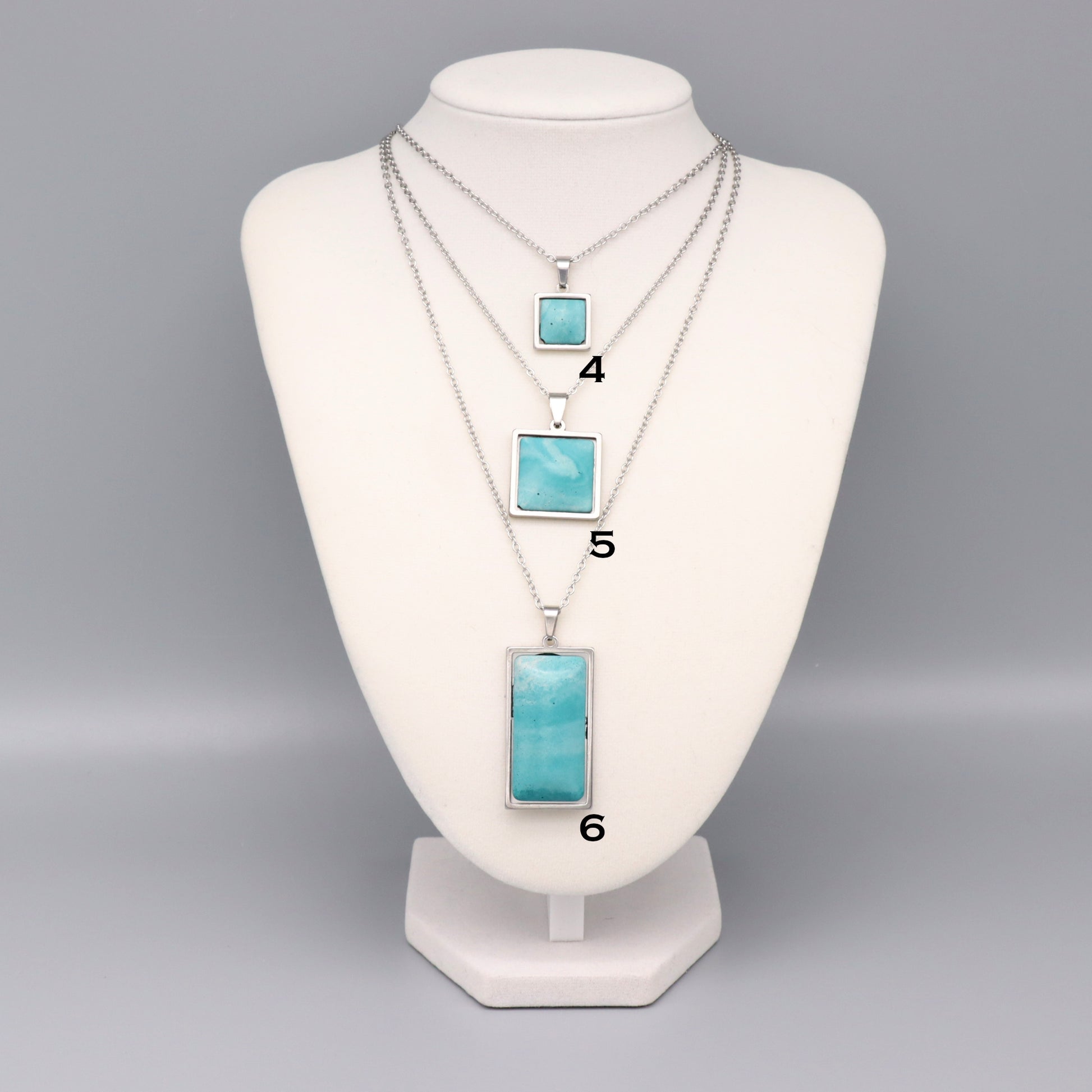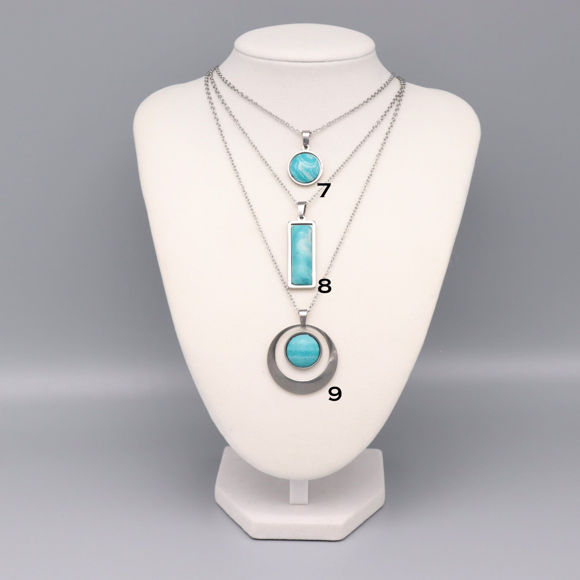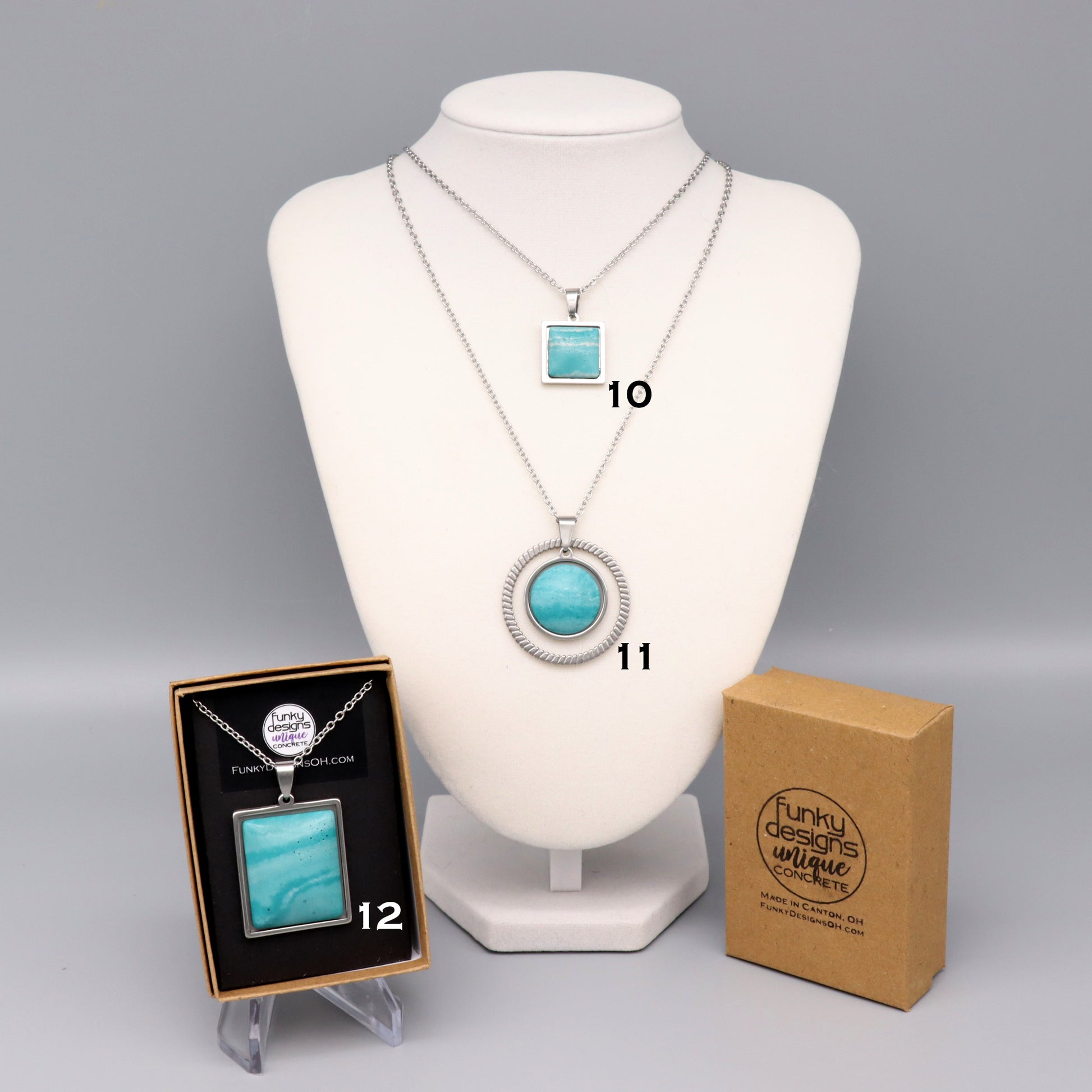 Most measurements appear as millimeters and refer to the size of the concrete stone unless otherwise stated. The bezel adds approximately 1mm on each side. Chain lengths appear in inches and are rounded to the nearest inch. All chains, as with the rest of the metal used in these pieces, are stainless steel.