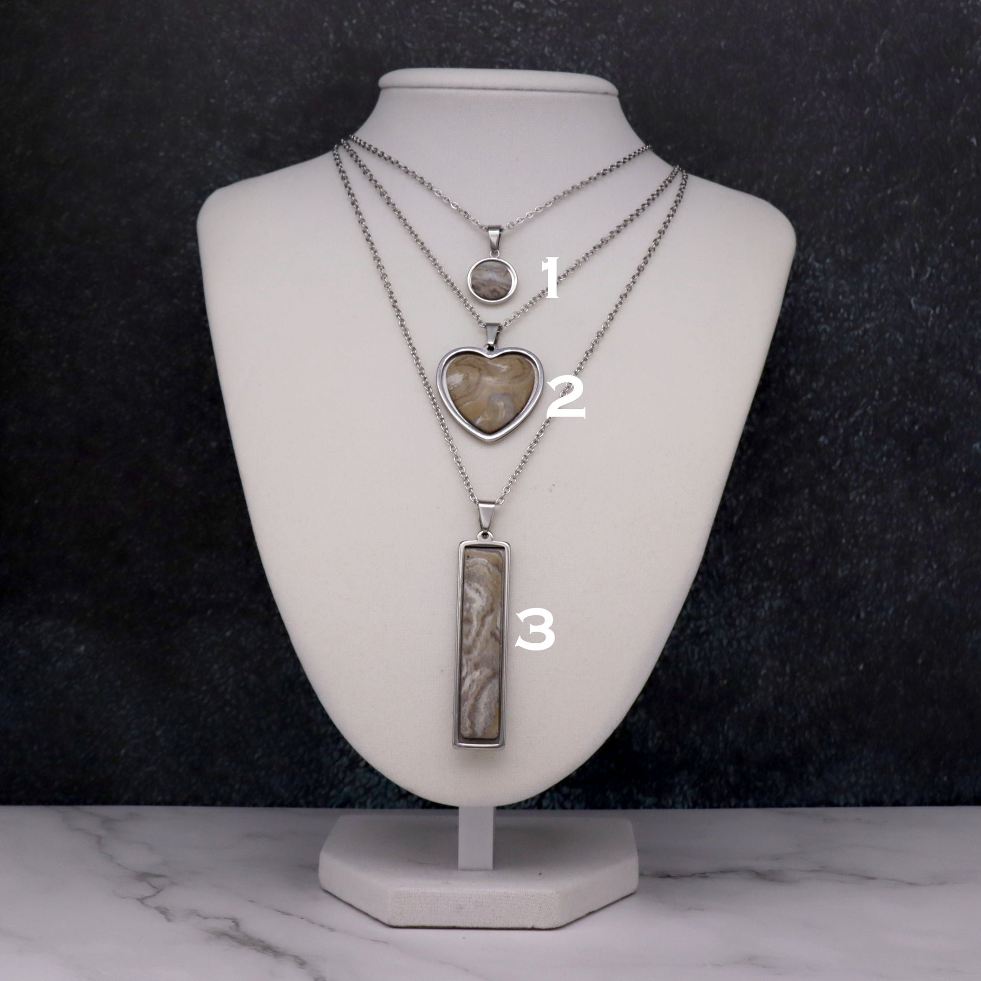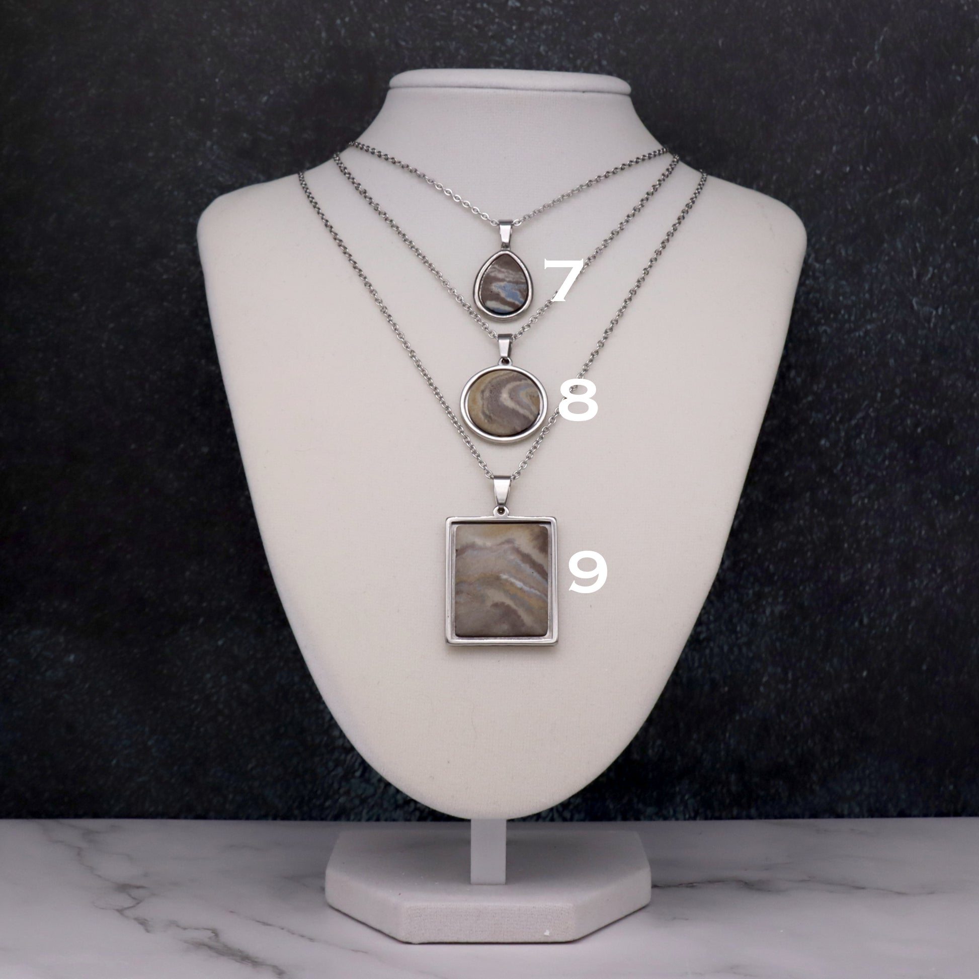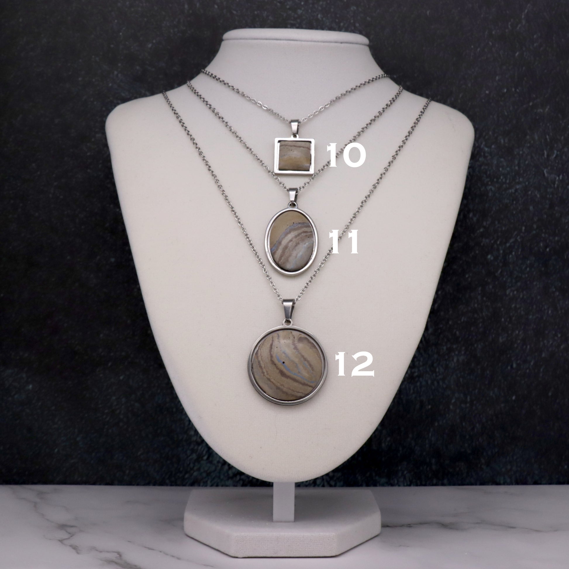 Most measurements appear as millimeters and refer to the size of the concrete stone unless otherwise stated. The bezel adds approximately 1mm on each side. Chain lengths appear in inches and are rounded to the nearest inch. All chains, as with the rest of the metal used in these pieces, are stainless steel.