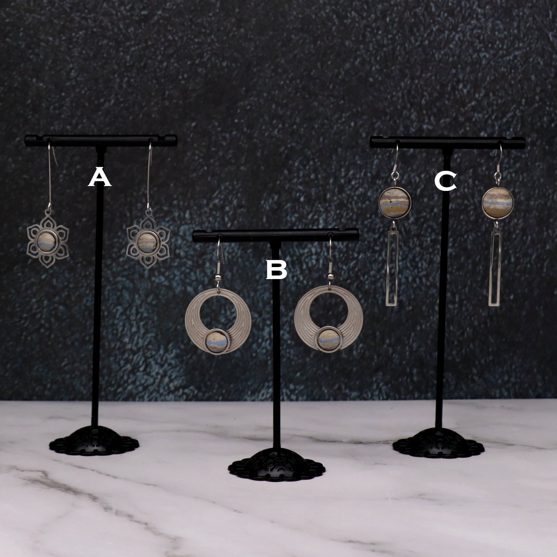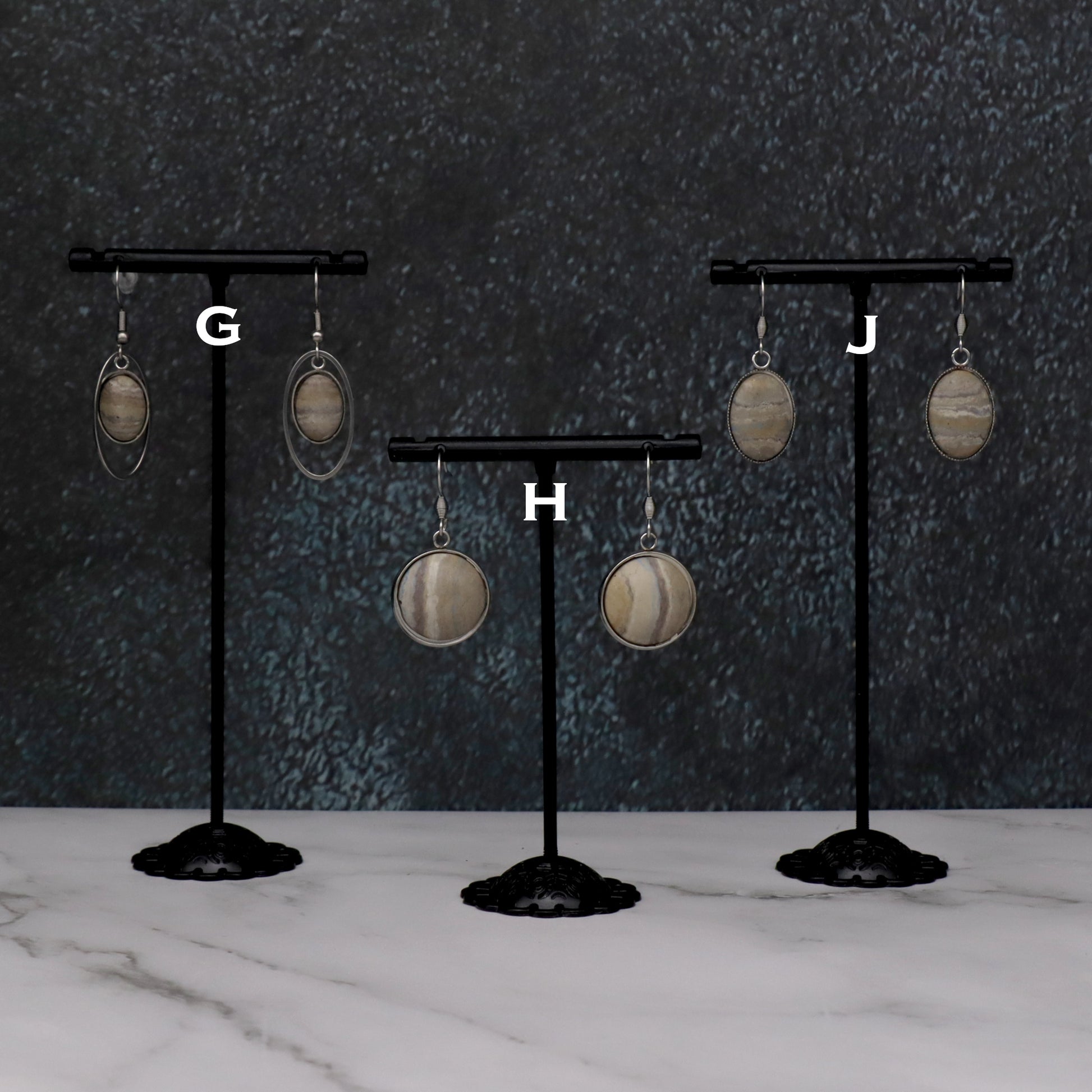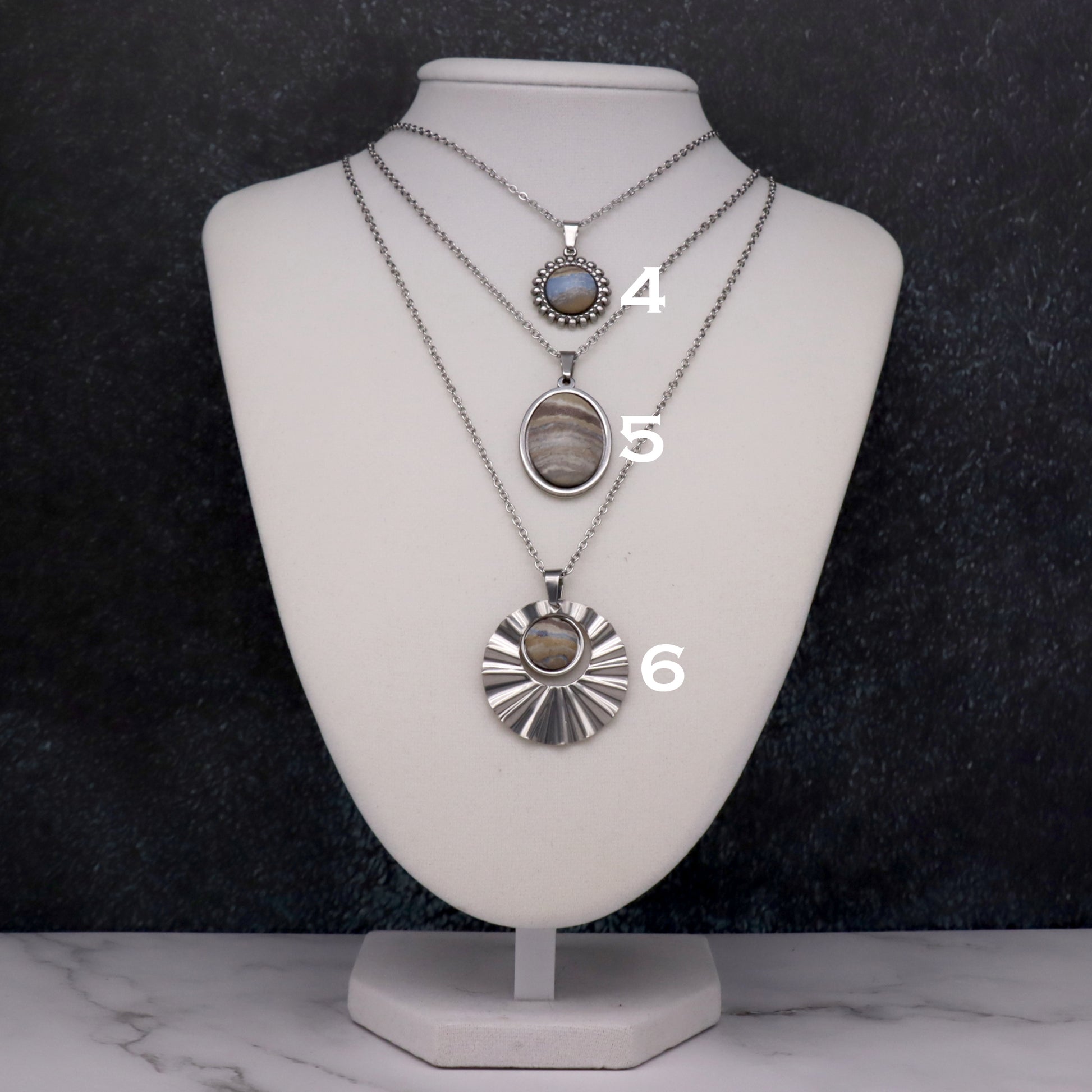 Most measurements appear as millimeters and refer to the size of the concrete stone unless otherwise stated. The bezel adds approximately 1mm on each side. Chain lengths appear in inches and are rounded to the nearest inch. All chains, as with the rest of the metal used in these pieces, are stainless steel.