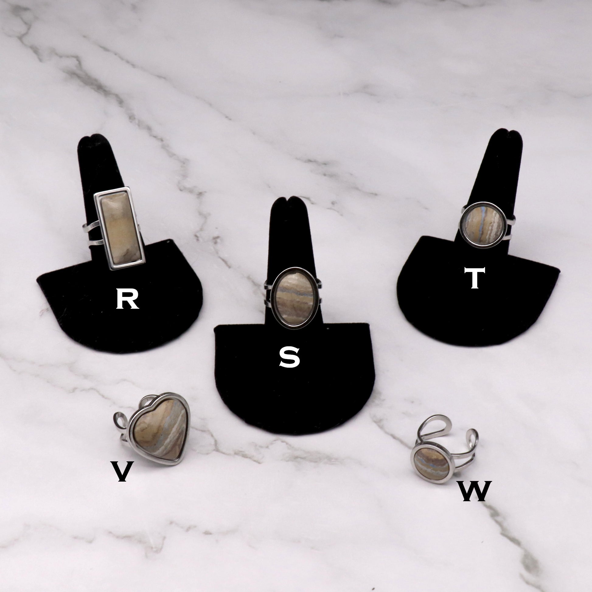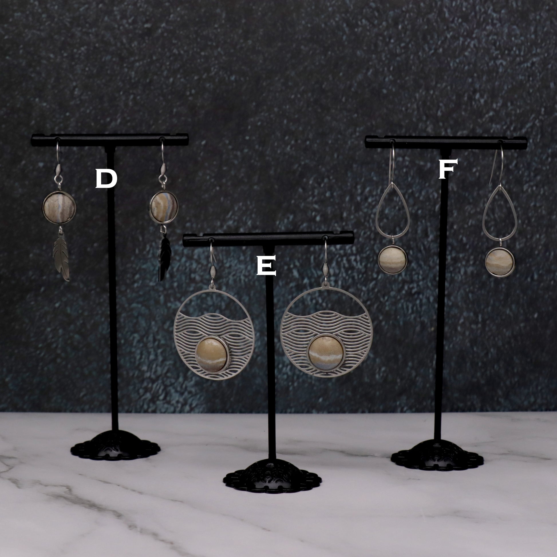 Each piece in this collection is the result of swirls of sesame, chocolate, blue, and white pigmented artisan concrete mounted on stainless steel settings with stainless steel accents and hardware.