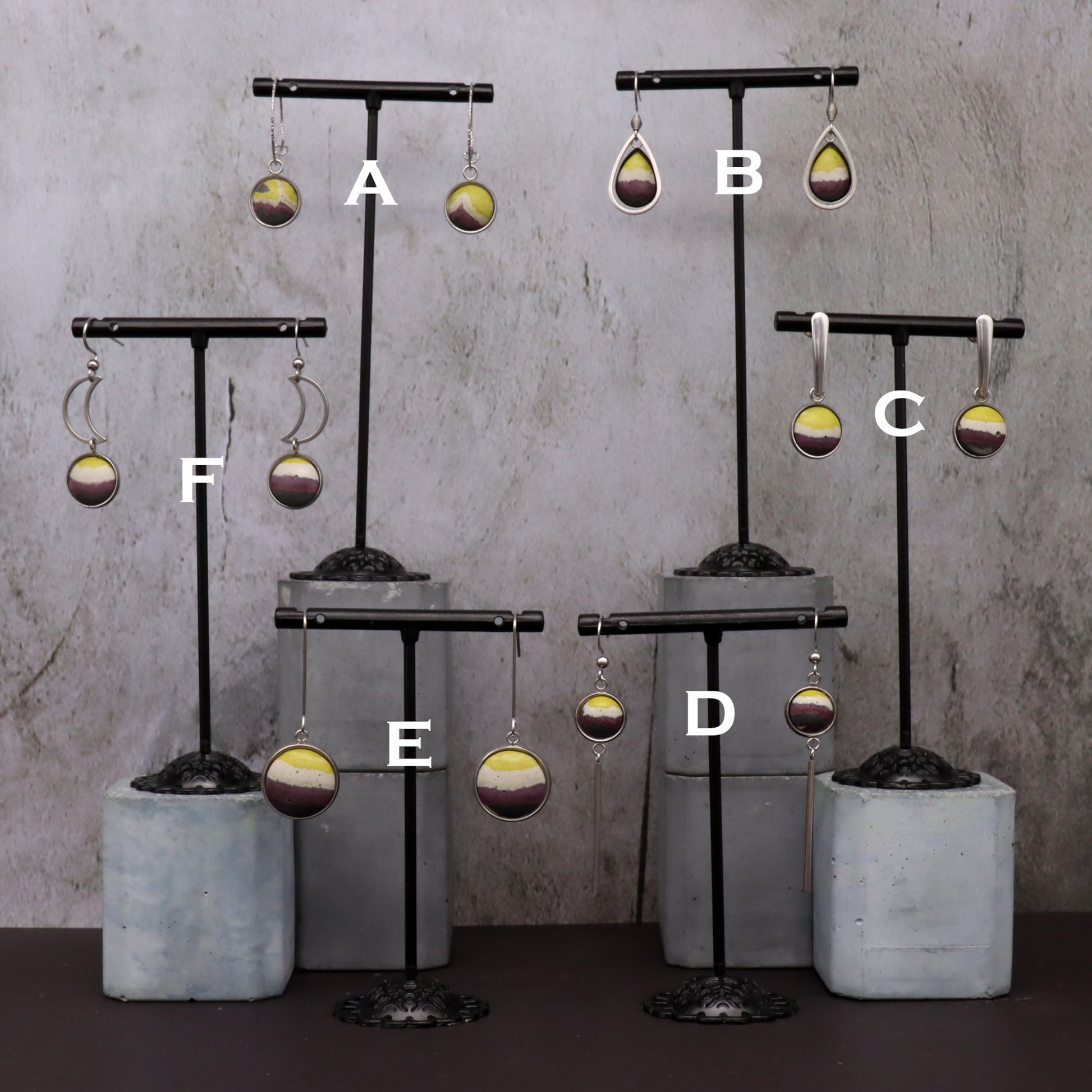 Each piece in this collection is the result of swirls of pigmented artisan concrete inspired by the Non Binary Pride flag mounted on stainless steel settings with stainless steel accents and hardware. These pieces are from my fundraiser for The Trevor Project. 25% of the purchase price is donated to this important organization to aid in their goal of ending youth LGTBQ+ suicide. The rest of the Concrete & Steel Pride Jewelry collection can be found here.